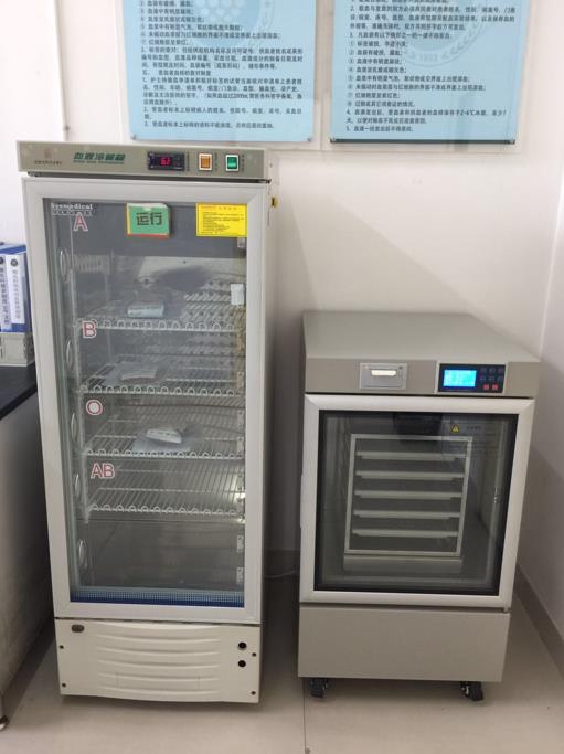 输血科具有完善的标准操作规程和全面质量管理体系,科室设储血室、配血室、发血室、值班室、资料保存室,配备有2℃sysmecal血液冷藏箱, -25℃DW-YL270医用冷藏箱、血小板震荡保存箱、冷链监控系统、FYQ免疫微柱孵育器及TD-A型血型血清学用离心机, 配血专用TDZ-WS离心机,SCR-50型恒温循环解冻箱、热合机、血样及试剂专用冰箱、试验用水浴箱等设施设备,为临床提供24小时输血医疗保障服务。