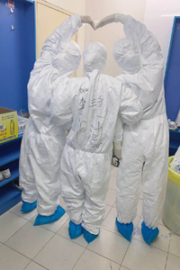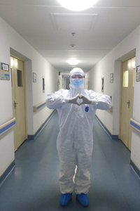 20多天了,这场战役并没有速战速决。她们想孩子了,父母想她们了,她们的爱人、未婚夫也放心不下了,可我们的天使,只有淡淡的一句:“放心吧,亲人们!没事儿的,我们有很好的救治方案和防护措施,最主要的我们医院还有抗击非典的丰富经验”。