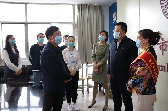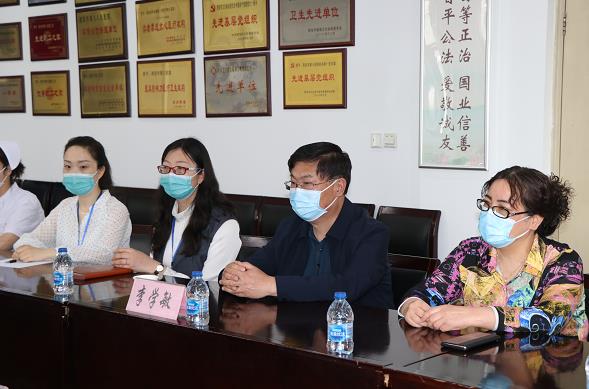 党委书记李学敏向徐辉副书记一行介绍了医院疫情应对工作,着重介绍了团员青年在抗击疫情中发挥的模范带头作用,特别是隔离一区医务人员逆行而上的英勇事迹。徐辉副书记对医院抗疫工作中和隔离一区医护人员在疫情期间的辛勤付出给予了高度肯定,他鼓励大家继续保持冲锋在前、迎难而上的昂扬斗志,坚决打赢疫情防控阻击战!