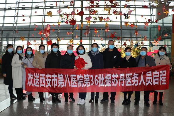2021年1月15日上午9 时,韩国三级 院长郭雅玲,副院长郭宗虎、张艳带领科教科、护理部、医务科、院办、人事科等科室负责人驱车来到西安咸阳国际机场,为韩国三级 参加第36批援苏丹医疗队医务人员送行。